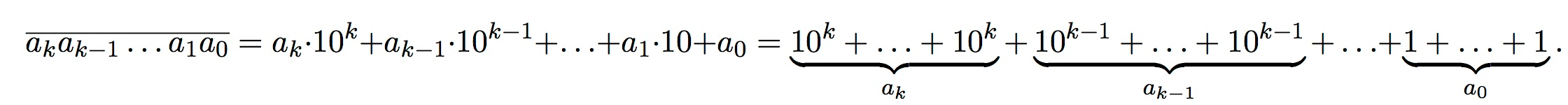 Общее количество слагаемых в таком разложении будет равно сумме цифр числа N. Таким образом, каждое натуральное число N<=1018 можно представить в виде суммы не более, чем 9 · 18 = 162 слагаемых. Осталось учесть дополнительные ограничения на количество слагаемых. Во-первых, слагаемых должно быть хотя бы 2, значит указанное разложение не подходит для чисел вида 10m, такие числа при m > 0 являются четными, поэтому их можно представить так: 10m =5·10m−1 +5·10m−1.